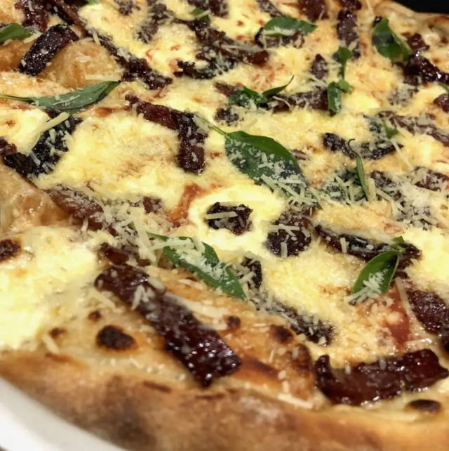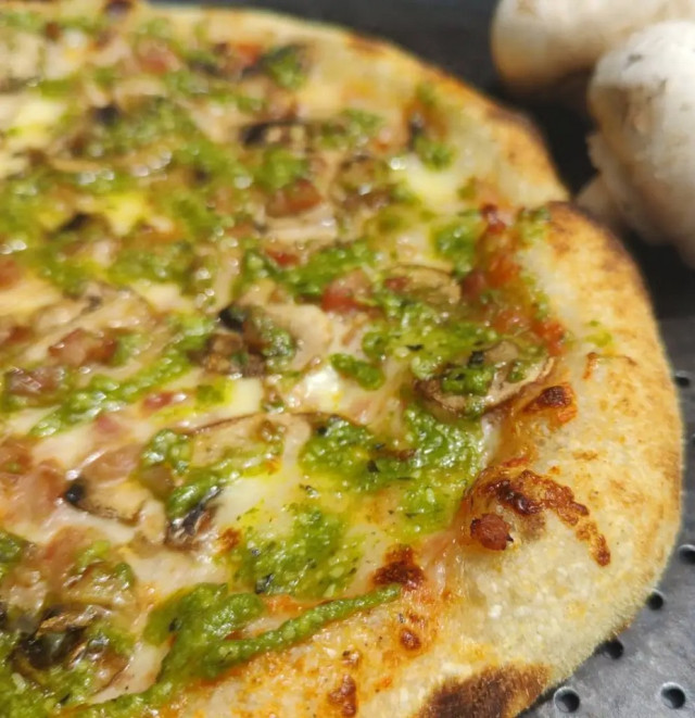 Descripción: Funghi e pesto: masa artesanal con masa madre madurada en frío, salsa pomodoro de la casa, queso mozzarella, champiñones, tocineta y finalizada con pesto fresco.