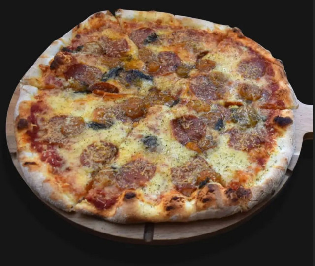 Descripción: Uchuva’s vibes: masa madurada, base de pomodoro artesanal hecho con tomate San Marzano, queso mozzarella, pepperoni madurado, uchuvas confitadas en aceite de oliva extravirgen, albahaca caramelizada y gratín de queso parmesano.