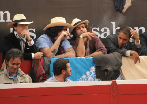 Andrés Calamaro, segundo de izquierda a derecha, conversó sobre las faenas. Se disfrutó la tarde en la Plaza de Toros de Manizales.