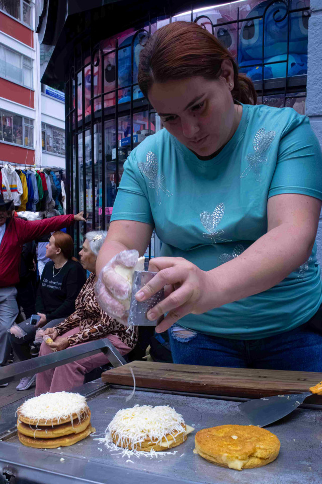 “La arepa está hecha con doble queso, trae también queso mozzarella en el medio y queso rallado cuajada por encima. Son bien quesudas. A la gente que le guste le echamos leche condensada. Esta arepa es esponjosa, suave y así les gusta más a las personas. La llevan con todo y les cuesta 5 mil pesos. Es buena, bonita y barata” exclama.