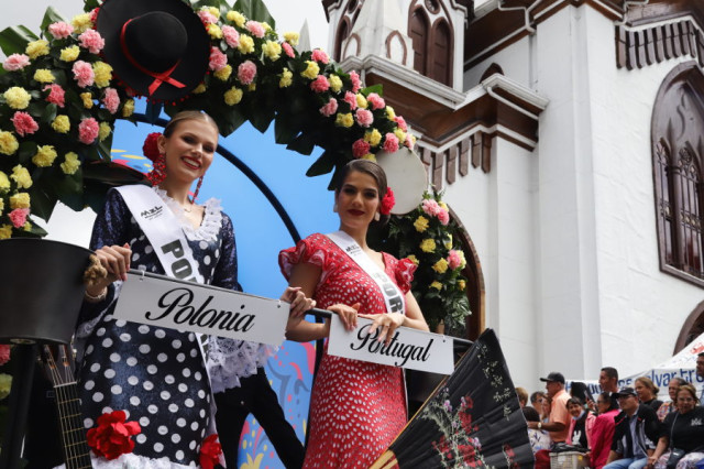Polonia y Portugal lucieron trajes con lunares blancos y compartieron la carroza decorada con claveles.