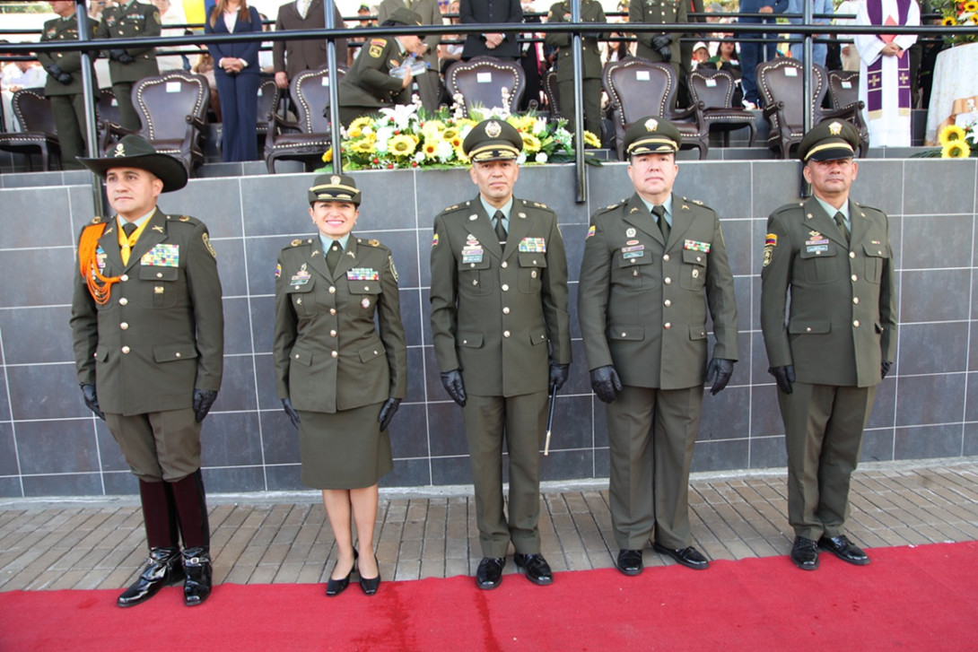 Integrantes de la mesa principal: teniente coronel Diego Armando Villar Cuella (director Esagu); coronel Rocío Milena Melo Puerto (comandante Policía Caldas); brigadier general Herbert Benavidez Valderrama (jefe nacional de Administración de Recursos de la Policía Nacional); coronel Dave Anderson Figueroa Castellanos (comandante Policía Metropolitana de Manizales), y comisario Alexánder Montaño Piñeros (mando ejecutivo Esagu).