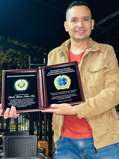 De izquierda a derecha: José Luis Berni (el Gordito de Oro), auxiliar de policía Valeria Pérez, subintendente Edwin Franco, subintendente Lina Granada, subintendente Lorena Arango, intendente jefe Nicolás Solarte (homenajeado); intendente jefe Alexánder Chiquillo, auxiliar de policía Karen Valencia e intendente Mauricio Vallejo.