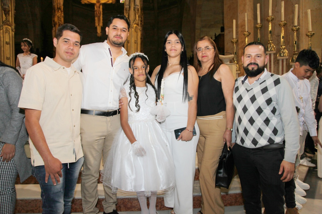Elena Ortiz, en su Primera Comunión, acompañada de su familia: Luis Ortiz, Luis Landi, Elena Ortiz, Dayana Landi, Fanny Vergara y David Vergara.