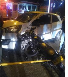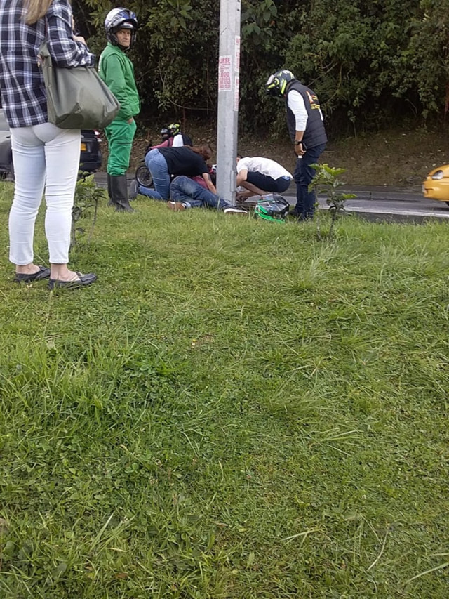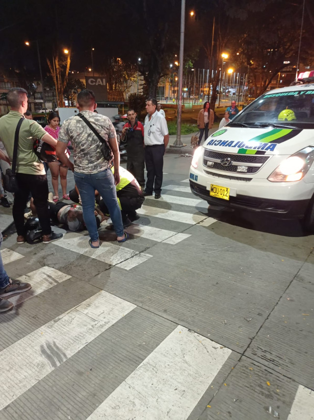 Manizales. Colisión entre moto y taxi en la carrera 12 con calle 20, de Liborio. Conductor de la motocicleta con traumas abdominales, trasladadopor Bomberos; la parrillera, llevada a Avidanti por ByR.