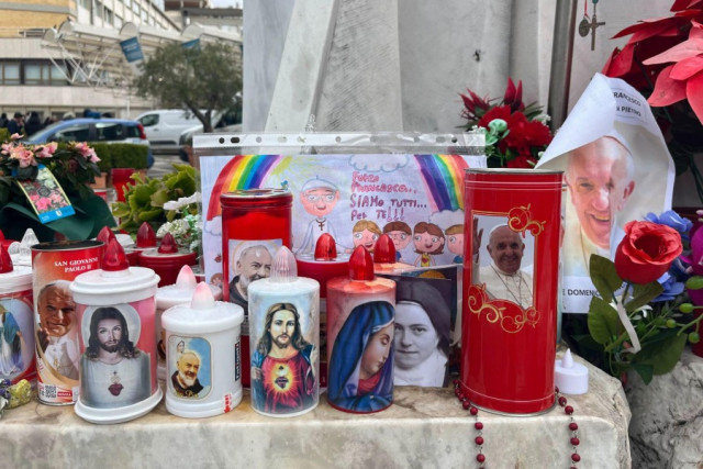 El altar improvisado que se instaló la semana pasada a los pies de la estatua de Juan Pablo II en la entrada del centro médico ha crecido significativamente en los últimos días, a medida que se conocían detalles sobre el empeoramiento del estado de salud de Francisco.