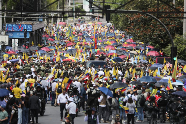 Noboa caminó firme con sus características gafas de sol, alzando el puño de tanto en tanto y saludando a los manifestantes al ritmo de los himnos patrios.