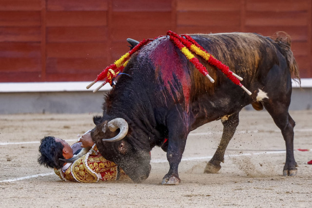 Foto | EFE | LA PATRIA Con tremenda fuerza en su arreón, derribó al torero para después soltarle varios y muy secos gañafones que solo alcanzaron ligeramente el objetivo.
