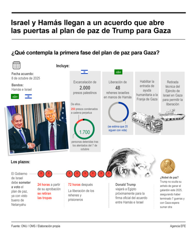 Hamás está a la espera de que el Gobierno israelí ratifique la primera fase del acuerdo para Gaza impulsado por el presidente Estado Unidos, Donald Trump, que implicará el intercambio de rehenes por presos palestinos, un alto el fuego y la entrada de ayuda humanitaria.