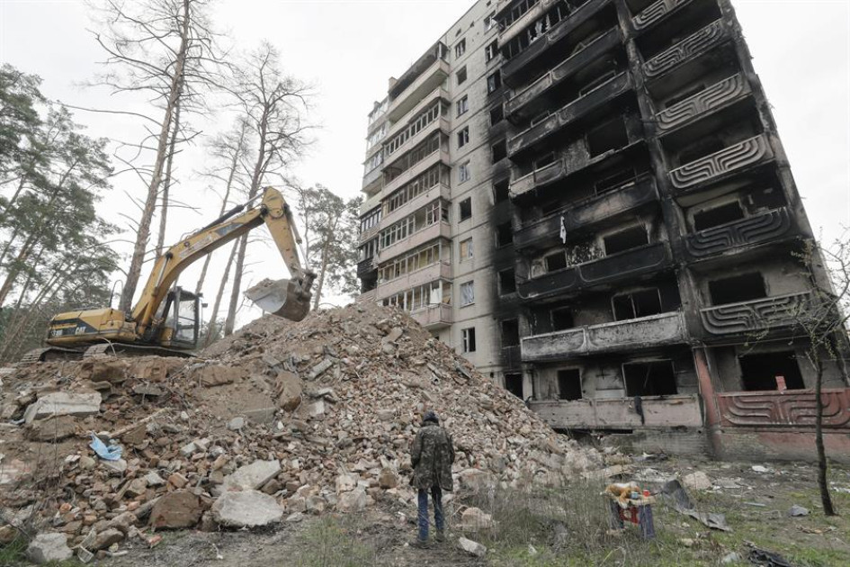 Los colombianos perdieron la vida el 30 de marzo y se recuperaron sus cuerpos el 15 de abril, según la Cancillería. En la foto, la demolición (ayer) de un edificio en Kiev que había sido afectado por la invasión rusa a Ucrania.