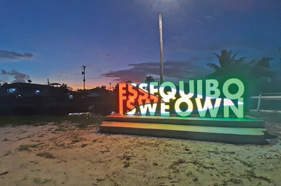 Fotografía de un letrero con el lema 'Esequibo es nuestro' en la orilla este del Esequibo. Guyaneses que habitan en la frontera con Venezuela comparten sentimientos de miedo y patriotismo ante los planes expansivos del Gobierno de Nicolás Maduro.