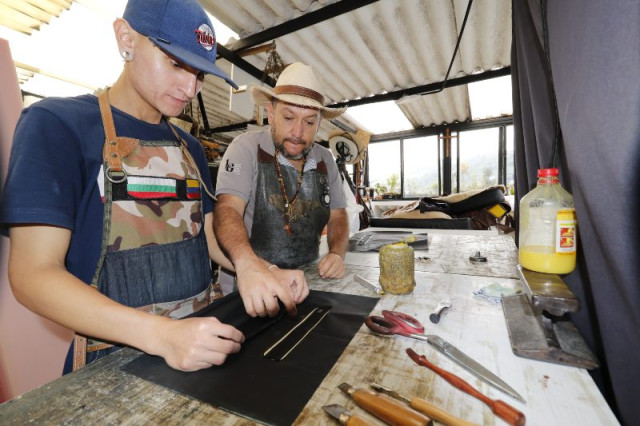 Federico Valdés, alumno de Ciencias Agronómicas de la Universidad de Caldas, combina sus estudios con el aprendizaje de la marroquinería. Elkin cuenta que por su taller ha pasado mucha gente que ha aprendido este arte.