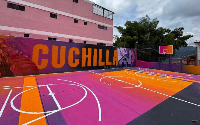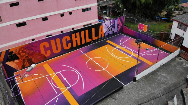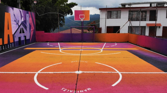 El manizaleño se ganó el incentivo y tuvo autonomía para hacer la intervención donde quisiera. En su búsqueda encontró la cancha de la Cuchilla del Salado porque, según dice, es de las mejores en la ciudad para plasmar lo que tenía en mente, sobre todo por los muros alrededor.