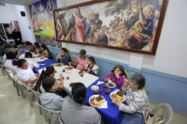 Con ellos comen el padre Luis Fernando Yepes Acevedo, el diácono Ramírez y voluntarias de la Fundación. De fondo, dos reflejos de la actividad: las obras de arte de la multiplicación de los panes y los peces y la última cena.