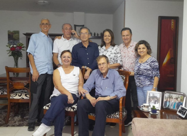 En la imagen con unos amigos asistiendo a una conferencia en Manizales.