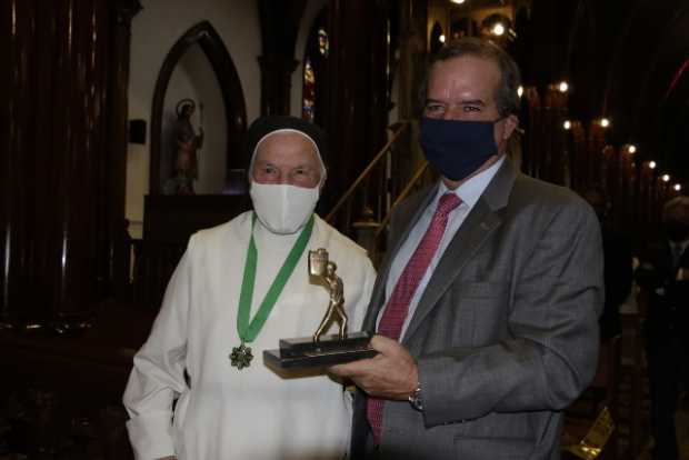 El entonces director de LA PATRIA Nicolás Restrepo Escobar le entregó en el 2020 el Voceador de Prensa a la hermana Ana María Echeverri Jaramillo, Caldense del Año 2019.