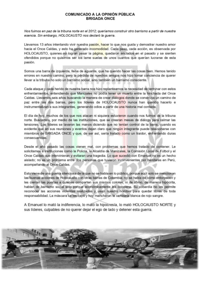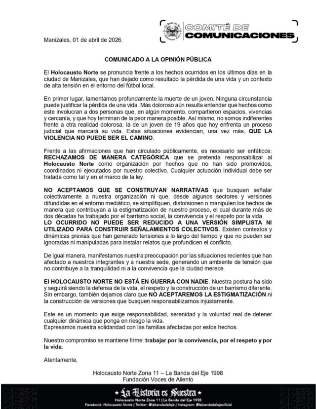 Primero fue Brigada el martes (31 de marzo), cuando afirmó que, desde su salida de la tribuna norte en el 2012, ha intentado vivir su pasión por el Once Caldas sin conflictos, pero acusa a Holocausto de haber iniciado una confrontación constante. Señala que, durante años, ha buscado promover un barrismo más consciente y pacífico, incluso proponiendo espacios de diálogo para evitar enfrentamientos, sin obtener respuesta positiva.