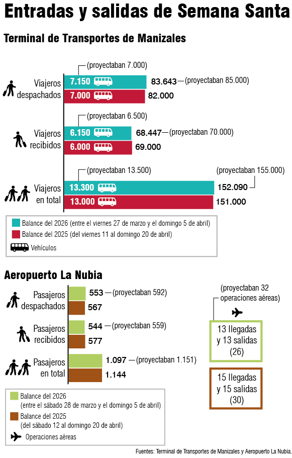 La Semana Santa dejó 153 mil 187 viajeros a su paso. Pese a no alcanzar las cifras proyectadas para la temporada, la terminal de Manizales superó su registro de entradas y salidas del 2025. El aeropuerto La Nubia se quedó corto frente a lo planeado, debido a un día sin vuelos. En ambos recintos reportaron normalidad durante las operaciones. Conozca las cifras completas.