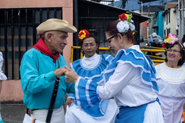 El grupo folclórico de danzas de Adulto Mayor de Centrovida llegaron desde Villamaría para disfrutar con los habitantes del barrio La Enea.