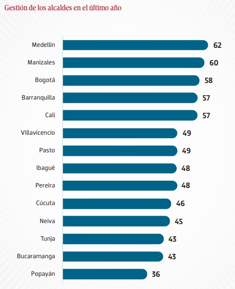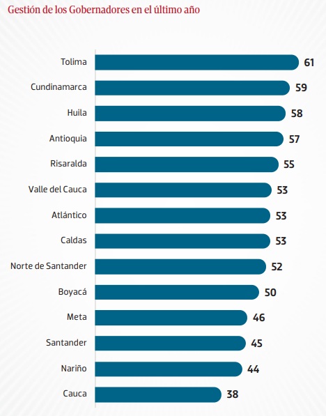 Por su parte, el gobernador de Caldas, Henry Gutiérrez Ángel, obtuvo 53 puntos, lo que lo coloca como el octavo mejor mandatario departamental del país. Con mejor calificación están los de Tolima (61), Cundinamarca (59), Huila (58), Antioquia (57), Risaralda (55), Valle del Cauca (53) y Atlántico (53).