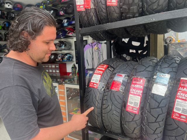 Sebastián Holguín, vendedor de llantas de moto, recomienda fijarse muy bien en la cantidad de canales de salida de agua, para que al momento de frenar tengan más adherencia a la superficie por la que se transita.