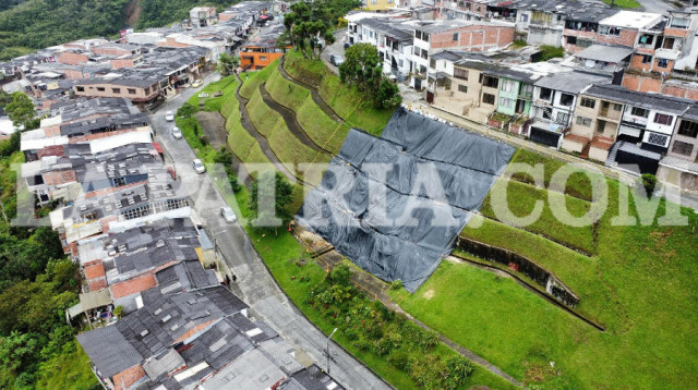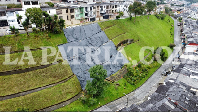 Un plástico negro cubre parte de una ladera que se ubica entre las calles 66a y 66b del barrio La Sultana de Manizales. Asimismo, una cinta amarilla cerca la zona por posible deslizamiento.