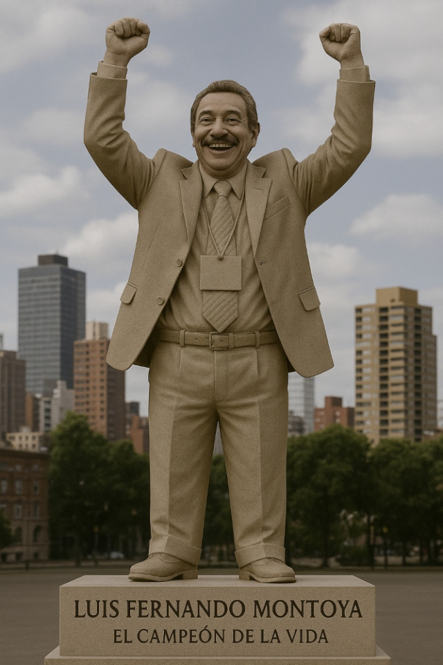 La IA ChatGPT generó esta imagen de una posible estatua del profesor Luis Fernando Montoya, “el campeón de la vida”.