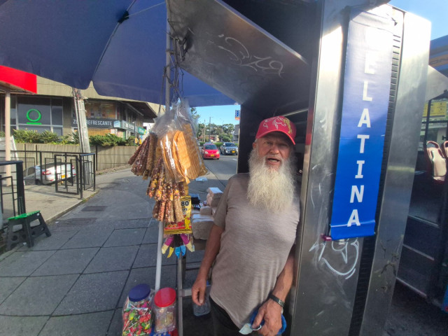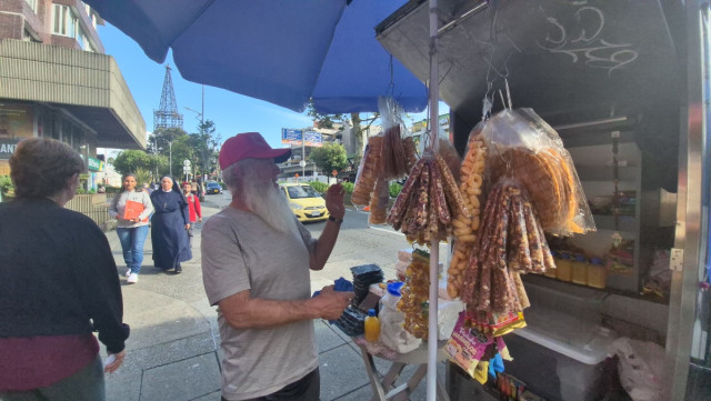 Martínez abre a las 11:00 de la mañana y trabaja durante ocho horas. Encima de sí cuelga una sombrilla azul que lo protege del clima y llena sus estantes con mercancía. Papá Noel, fiel a su personaje, saluda a todos los transeúntes y ofrece sus dulces.