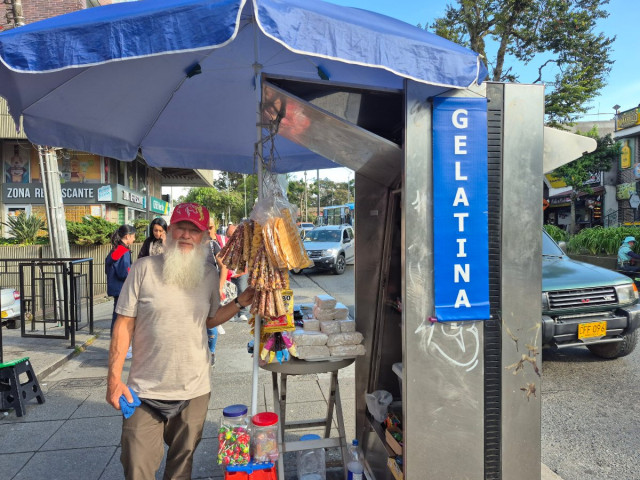La vida le sonríe a Papá Noel en Manizales: "El trabajo es mi mayor arma contra la depresión", señala José Rubiel Martínez Echeverri, quien se mudó de El Triángulo a El Cable con su venta de dulces. Ahora tiene un módulo metálico.