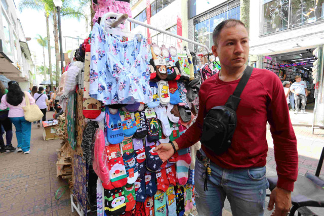 Hace cuatro años Jefferson Bermúdez Blandón empezó a trabajar como vendedor informal. En Navidad vende gorros, papel de regalo y medias estampadas con personajes como Los Simpson, Mario Bros y Las Chicas Superpoderosas, que son las más solicitadas por los compradores, pero este año ha sido duro. “Durante 20 días estuve sin vender nada”, dice. Explica que los precios suelen subir a partir del 15 de noviembre, pero él decide no hacerlo para poder vender todo el inventario. “Hasta la fecha me ha ido regular a comparación de años anteriores. Antes, por esta época, ya vendía hasta las pilas para los carros de los niños del 24 de diciembre”.