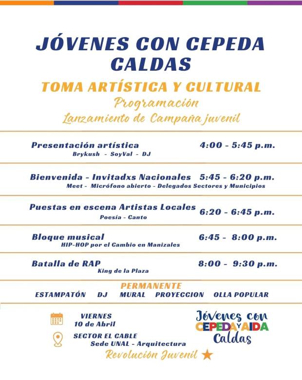 Esa convocatoria llevó a que la Universidad Nacional de Colombia, Sede Manizales, publicara un comunicado dirigido a la comunidad universitaria y a la ciudadanía en general sobre el evento denominado Jóvenes con Cepeda Caldas - Toma artística y cultural.