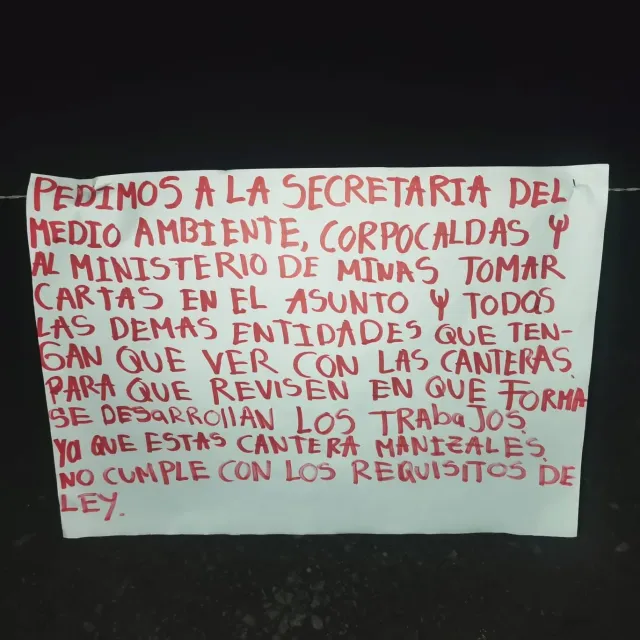 La comunidad reclama la presencia de Secretaría Municipal de Medio Ambiente, Corpocaldas y Ministerio de Minas para que tomen acciones frente a esta situación.