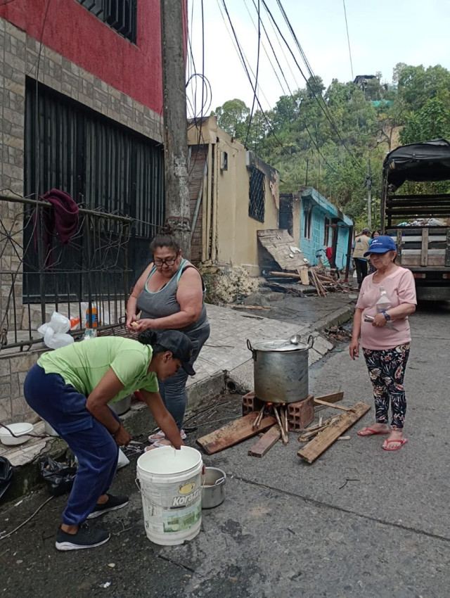 Sin embrago, en medio de las pérdidas materiales por las que atraviesan los afectados, Gloria se las ingenió, agarró dos ladrillos y en medio de ellos insertó madera para hacer un improvisado fogón en la calle y preparar el almuerzo en una gran olla de aluminio.