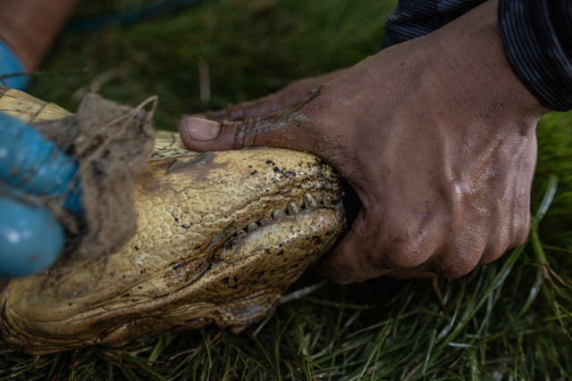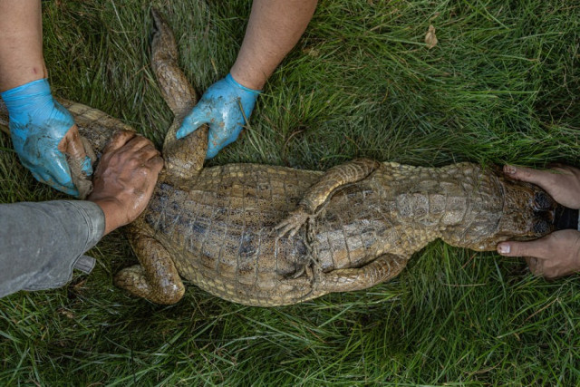 "Este es el primer caimán que rescatamos, porque estos son animales que bucean y pues así esté el cuerpo lleno de petróleo, cuando vamos por ellos, agarran el agua de inmediato", explicó.