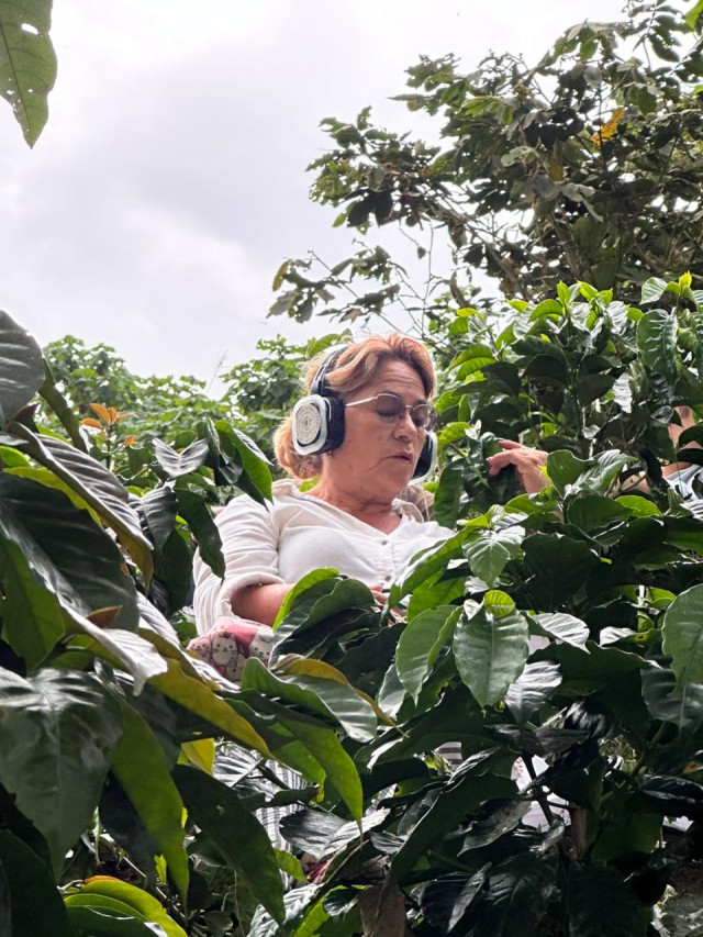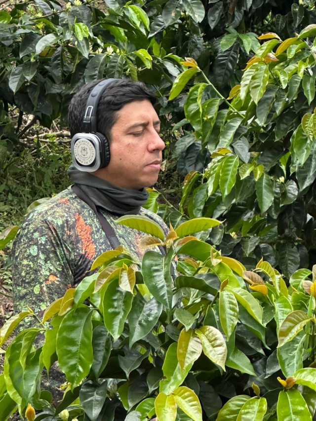 Luego, guiados por el argentino a través de los audífonos, recorrieron un sendero de la finca, escucharon de cerca el caer del agua en una cascada y se sentaron entre palos de café para escuchar la melodía del café casi florecido.