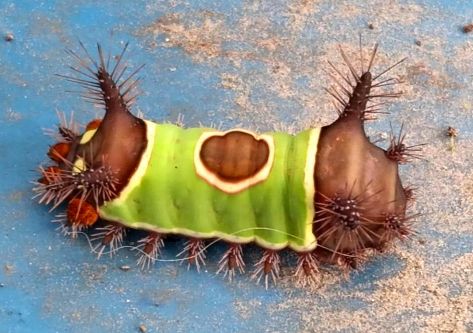 La oruga ensillada tiene colores llamativos para advertir sobre el peligro que representan los pequeños espinos que sobresalen en todas direcciones de su cuerpo.