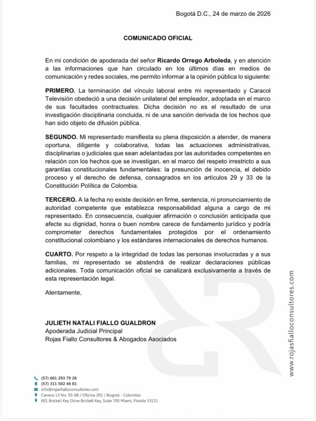 "Hemos decidido dar por terminado el vínculo laboral con el señor Ricardo Orrego y se ha terminado de mutua acuerdo el contrato laboral con el señor Jorge Alfredo Vargas. Estas decisiones no constituyen un juicio de valor sobre los hechos denunciados, ni implican una conclusión sobre responsabilidades individuales", señaló Caracol Televisión hoy en un comunicado.