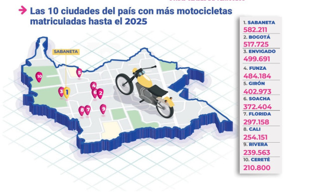 Las ciudades del país con más motocicletas registradas en el 2025 fueron Sabaneta (582.211) y Bogotá (517.725).