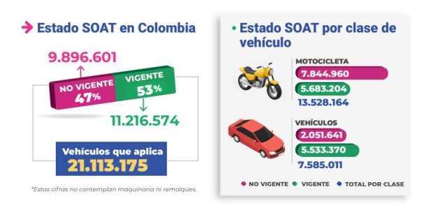 Del total del parque automotor, 9.896.601 de vehículos finalizaron el año con el SOAT vencido, lo que representó una evasión del 47%. En este escenario, la motocicleta fue la clase con mayor nivel de incumplimiento.