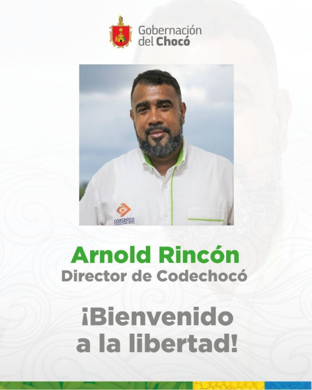 "Celebramos profundamente la liberación del director de Codechoco, Arnold Rincón. Su vida y trabajo por la selva chocoana son fundamentales para la construcción de paz en los territorios. Reiteramos nuestro compromiso con una justicia ambiental que proteja a quienes cuidan la vida”, manifestó la ministra de Ambiente, Lena Estrada Añokazi, citada en un comunicado.