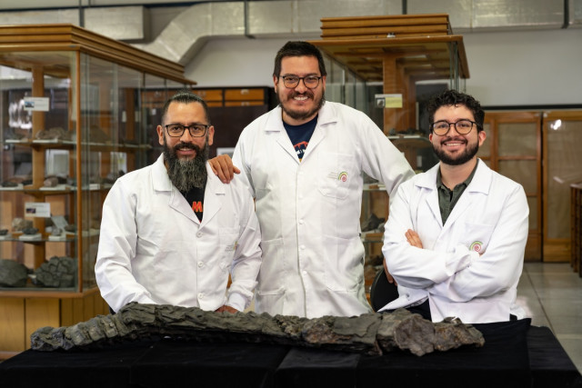 Daniel Pomar, Cristian Benavides y José Narváez, investigadores paleontológicos del Museo Geológico Nacional José Royo y Gómez.