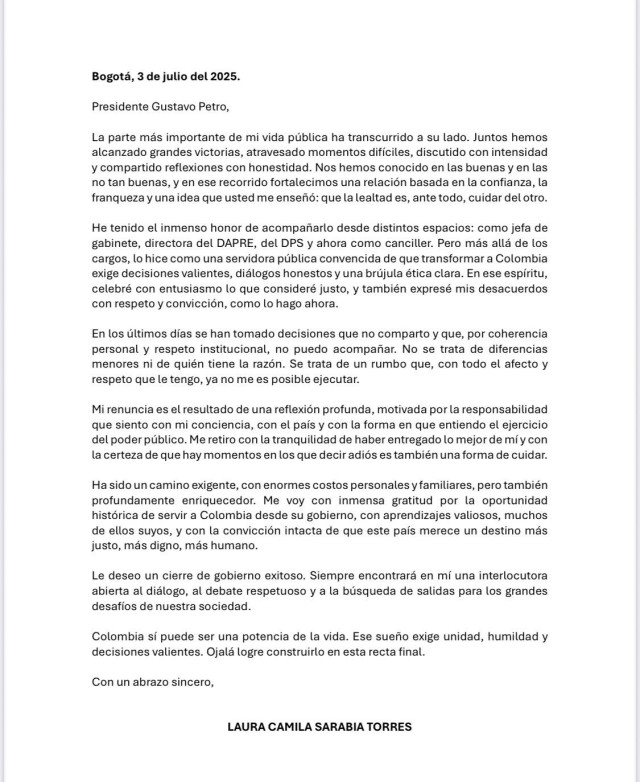 "Mi renuncia es el resultado de una reflexión profunda, motivada por la responsabilidad que siento con mi conciencia, con el país y con la forma en que entiendo el ejercicio del poder público", manifestó Sarabia en una carta dirigida a Petro.