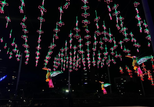 La iluminación incluye un árbol navideño de 25 metros de alto, adornado con orquídeas moradas que ofrece una experiencia inmersiva en la ciudad, que ya se iluminó con velas y faroles en la tradicional Noche de las Velitas, una vigilia previa a la Inmaculada Concepción que marca el inicio de las fiestas navideñas en el país.