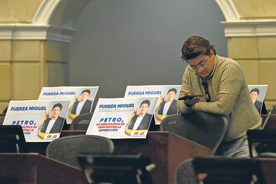 Carteles reposan sobre las curules de distintos senadores con la imagen del senador Miguel Uribe Turbay como un homenaje al político víctima del atentado sicarial en Bogotá.