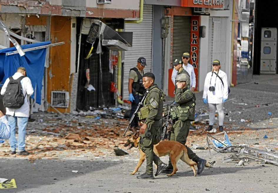 Integrantes de la Policía Nacional recorren el lugar donde explotó ayer una motocicleta-bomba en Jamundí (Valle del Cauca).