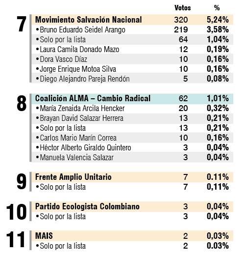 El podio lo completaron el lizcanismo, avalado por Alianza Social Independiente (ASI), y la coalición Centro Democrático - Partido de la U. Hasta ahora, tienen dos votos de distancia entre sí. ASI sumó 805 y la coalición del uribismo con la U, 803.
