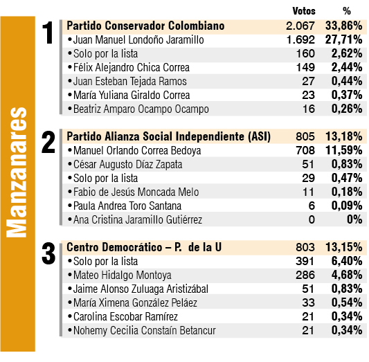 En Manzanares (Caldas), el Partido Conservador lidera en solitario. Entretanto, el lizcanismo y el uribismo solo se sacan dos votos de diferencia. Vea las cifras de las elecciones para la Cámara de Representantes.