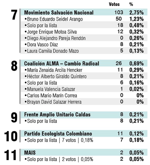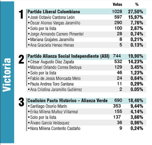 A pesar de que el Pacto Histórico lideró en votaciones en el departamento, en este municipio del Magdalena Caldense dominó el Partido Liberal seguido por la Alianza Social Independiente (ASI).