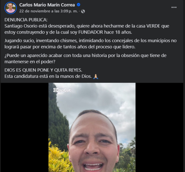 El pasado sábado (22 de noviembre), la ruptura saltó a redes sociales. Durante 1 minuto y 5 segundos de video, el exalcalde Marín señaló a su primo congresista de orquestar un intento para que Alianza Verde no avale su campaña al Congreso.