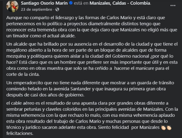 La relación cambió desde el 23 de septiembre de este 2025. En esa fecha, el congresista Osorio cuestionó el liderazgo del alcalde Rojas y, de paso, elogió el trabajo de Marín Correa para construir la línea 3 del cable aéreo en la capital caldense.